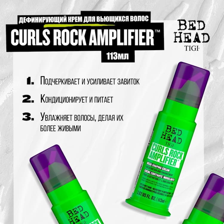 TIGI Bed Head CurlRock Amplifier Дефинирующий крем для вьющихся волос 113 мл. Отлично подходит для волнистых и вьющихся волос. Ищете невероятную четкость локонов? Крем для вьющихся волос Curl Rock Amplifier от Bed Head обеспечивает локонам длительную фиксацию, защищая волосы от вьющихся волос, распутывания и влажности. Насыщен кондиционирующим агентом и интенсивной увлажняющей смесью для глубокого кондиционирования, увлажнения и подчеркивания каждого локона. Для невероятных вьющихся волос! Curls Rock AmplifierTM компании Bed Head: ваш любимый Catwalk от TIGI Curls Rock AmplifierTM теперь включен в линейку Bed Head от TIGI. Мощная формула для определения локонов, не только разработанная, но и используемая профессионалами салонов красоты. Достижение салонных результатов и салонных впечатлений дома. Выделите и улучшите локоны и волны с помощью Bed Head Curls Rock Amplifier™! Этот крем для вьющихся волос обеспечивает длительную фиксацию и контроль локонов, защищая волосы от вьющихся волос, распутывания и влажности. Крем для укладки волос также увлажняет, увлажняет и кондиционирует локоны, придавая вьющимся волосам блестящий и здоровый вид. Для невероятных кудрей! Насыщен легким фиксирующим и кондиционирующим агентом, который помогает кондиционировать волосы, улучшая их форму и форму и предотвращая вьющиеся волосы, интенсивную увлажняющую смесь, которая связывает влагу внутри волос для глубокого увлажнения каждого локона, провитамин B5, чтобы улучшить состояние и подвижность волос, придавая им четкий вид и ощущение, укладка для длительного определения и контроля локонов даже в условиях высокой влажности и масла жожоба, богатого антиоксидантами и витамином Е. Очаровательный аромат летних фруктов.